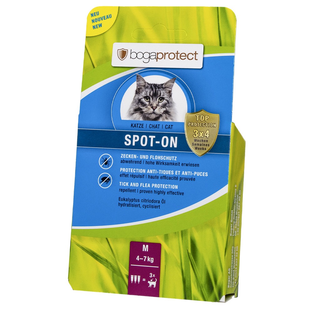 As pipetas bogaprotect SPOT-ON atuam na proteção e prevenção contra pulgas e carraças, com efeito imediato e duração de até 4 semanas.